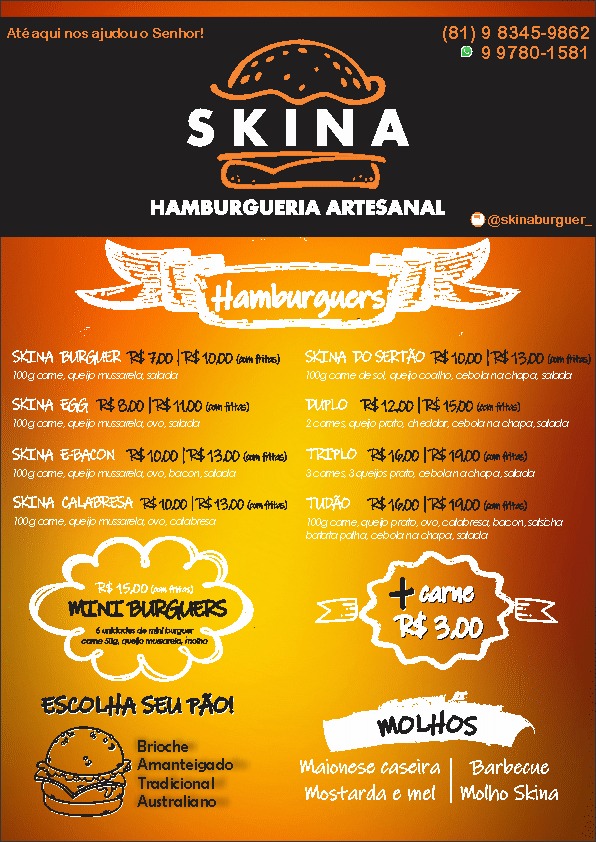Welcome to Skina Hamburgueria Artesanal, a gem nestled in Guararapes, Brazil, where gourmet meets comfort. With a diverse menu that caters to every palate, Skina seamlessly combines flavors and local ingredients. Their standout offerings include the delicious Hamburguer de Churrasco and the savory Hamburguer de Linguiça, perfect for meat lovers. Feedback from patrons like Natalia Brito highlights the attentive service and inviting atmosphere, complemented by crispy, perfectly cooked fries and refreshing drinks like their cajá juice. Each bite of their handcrafted burgers, made with passion and freshness, promises a unique gastronomic adventure. Skina also provides a comfortable space with free Wi-Fi, making it an ideal spot for gatherings or a casual bite. Whether you are a local or just passing through Jaboatão dos Guararapes, Skina Hamburgueria Artesanal is the ultimate destination for burger enthusiasts seeking quality and flavor.